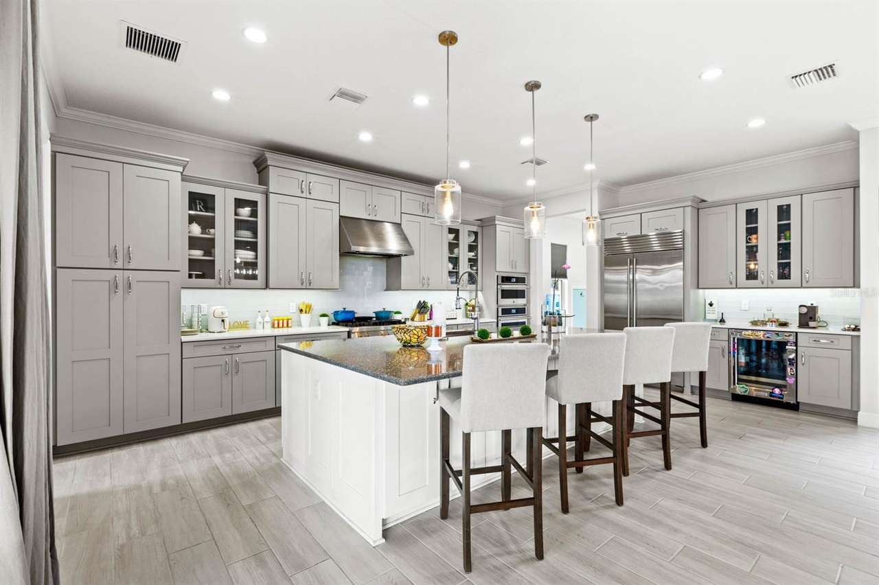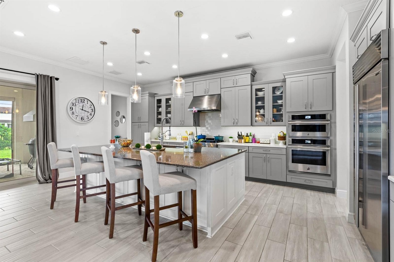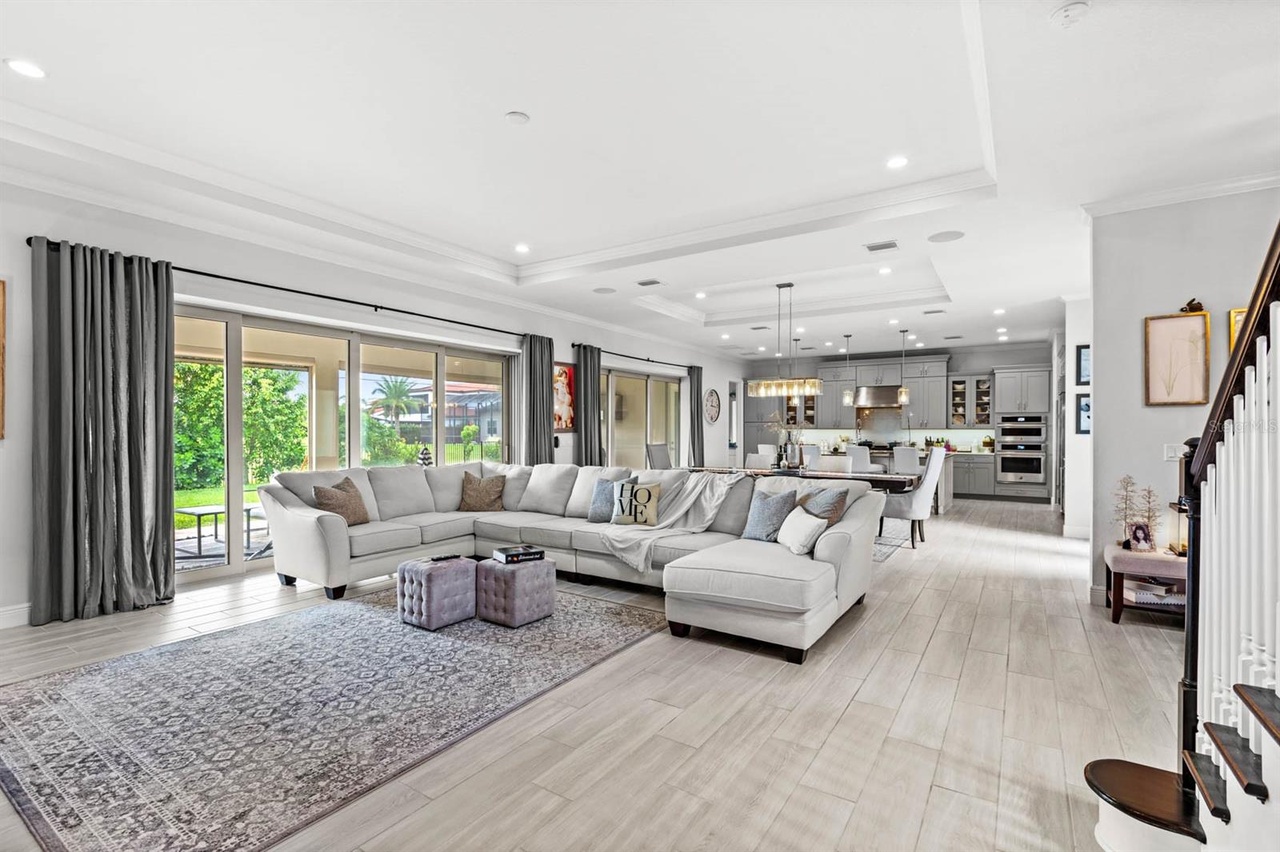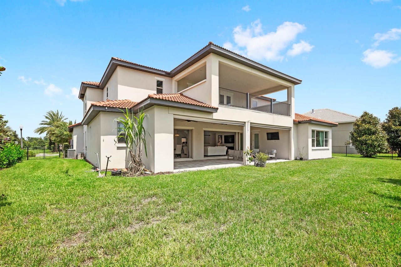 Welcome to this exquisite modern mediterranean home located in the prestigious Lakeshore Preserve community of Winter Garden. Built in 2019 by Toll Brothers, the 4,296 square foot, 5-bedroom, 5.5- bathroom estate captures your attention even before walking in the door. The paved circular driveway, leading to the grand governor’s entrance, showcases separate garages for a total of 3 cars, as well as a wrought iron gated paved courtyard which is the perfect spot to enjoy a cup of coffee in the morning. Upon entering, you’re captivated by the open-concept design, ideal for those who love to entertain! The family room, living room and kitchen flow seamlessly into each other creating a warm and inviting atmosphere and all are adorned with a coffered ceiling featuring crown molding. The gourmet kitchen is fully equipped with premium JennAir appliances including a wall-mounted microwave, wall-mounted oven, dishwasher, and a 6-burner gas stove with a pro-style hood. Additionally, there’s a Sub-Zero side- by-side refrigerator and KitchenAid beverage/wine refrigerator all encased in custom cabinetry. Just off the kitchen, is a large mud room which also conceals the laundry room and walk-in pantry. Complementing the incredible living areas is the view out to the dry pond and fenced-in yard boasting mature landscaping easily maintained with a multi-zone programmable irrigation system with rain sensors and highlighted with elegant landscape lighting. For those cool Florida nights, take advantage of the indoor/outdoor living experience and open the oversized pocket doors that line the length of the great room. Imagine hosting soirees on the paved extended lanai complete with the upgraded outdoor kitchen package giving you the option to design your dream patio using existing upgrades including a stainless-steel hood, gas pre-plumb, remote-controlled rolldown screens, ceiling speakers pre-wire, can lighting, power for media/TV, 3 ceiling fans and access to the primary suite and cabana half bathroom. The primary suite is located on the first level and is unlike other Maranello floor plans in the community as it boasts a modified layout with a bay window, extended closet, coffered ceiling with crown molding, and mahogany wood floors. The bathroom includes a garden tub and oversized steam and rain shower showcasing floor to ceiling porcelain tile and a custom glass enclosure. There’s a powder bath down the hall as well as one bedroom complete with an ensuite bathroom both featuring wood look tile. Upstairs, you’ll find a large loft, which can be used as a second living room or play area as well as three additional bedrooms with walk-in closets and two full bathrooms. The highlight of the second floor is the incredible oversized balcony which is accessible via French doors and is complete with ceiling speakers pre-wire, can lighting, power for TV and pre-wire for 2 fans. One of the bedrooms also has private access to the balcony. Owners within the community have exclusive entry to a resort-style clubhouse complete with a fitness center, pool area, dog park and even lake access with a boat ramp! You’re less than 10 minutes to Walt Disney World, the Orange County National Golf Center and a variety of amenities including Starbucks and New York Beer Project.