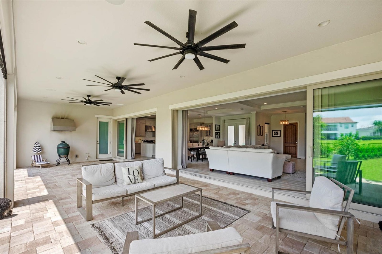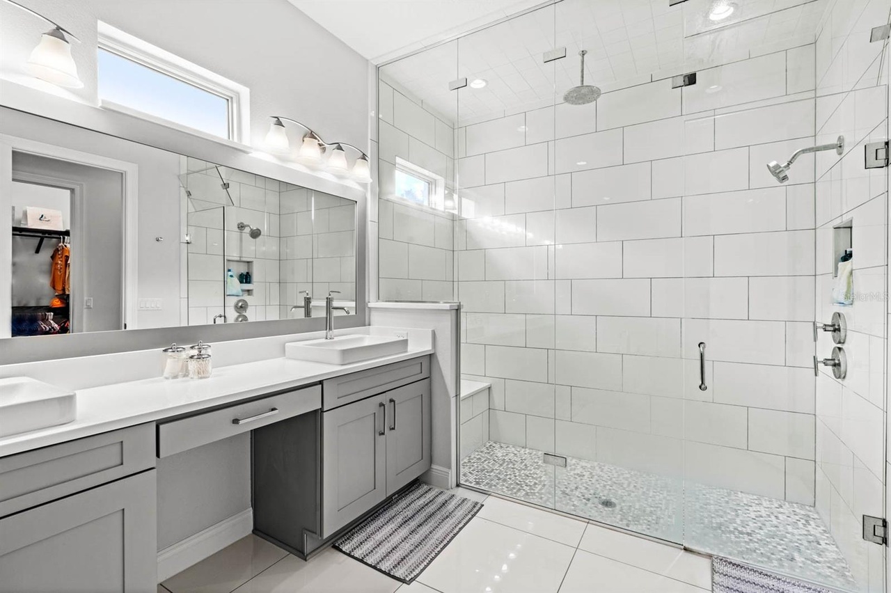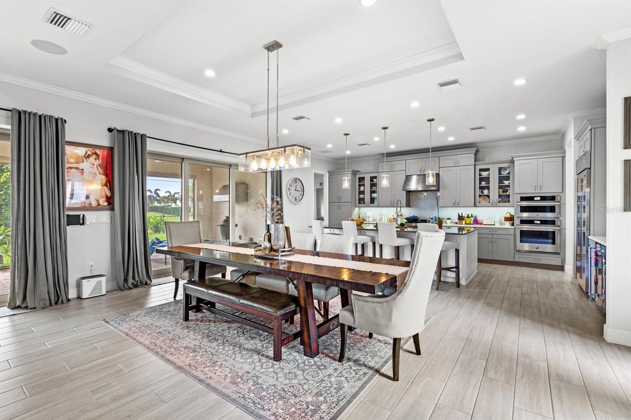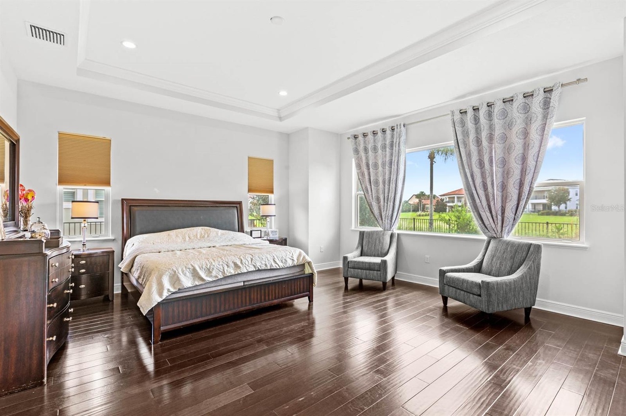 Welcome to this exquisite modern mediterranean home located in the prestigious Lakeshore Preserve community of Winter Garden. Built in 2019 by Toll Brothers, the 4,296 square foot, 5-bedroom, 5.5- bathroom estate captures your attention even before walking in the door. The paved circular driveway, leading to the grand governor’s entrance, showcases separate garages for a total of 3 cars, as well as a wrought iron gated paved courtyard which is the perfect spot to enjoy a cup of coffee in the morning. Upon entering, you’re captivated by the open-concept design, ideal for those who love to entertain! The family room, living room and kitchen flow seamlessly into each other creating a warm and inviting atmosphere and all are adorned with a coffered ceiling featuring crown molding. The gourmet kitchen is fully equipped with premium JennAir appliances including a wall-mounted microwave, wall-mounted oven, dishwasher, and a 6-burner gas stove with a pro-style hood. Additionally, there’s a Sub-Zero side- by-side refrigerator and KitchenAid beverage/wine refrigerator all encased in custom cabinetry. Just off the kitchen, is a large mud room which also conceals the laundry room and walk-in pantry. Complementing the incredible living areas is the view out to the dry pond and fenced-in yard boasting mature landscaping easily maintained with a multi-zone programmable irrigation system with rain sensors and highlighted with elegant landscape lighting. For those cool Florida nights, take advantage of the indoor/outdoor living experience and open the oversized pocket doors that line the length of the great room. Imagine hosting soirees on the paved extended lanai complete with the upgraded outdoor kitchen package giving you the option to design your dream patio using existing upgrades including a stainless-steel hood, gas pre-plumb, remote-controlled rolldown screens, ceiling speakers pre-wire, can lighting, power for media/TV, 3 ceiling fans and access to the primary suite and cabana half bathroom. The primary suite is located on the first level and is unlike other Maranello floor plans in the community as it boasts a modified layout with a bay window, extended closet, coffered ceiling with crown molding, and mahogany wood floors. The bathroom includes a garden tub and oversized steam and rain shower showcasing floor to ceiling porcelain tile and a custom glass enclosure. There’s a powder bath down the hall as well as one bedroom complete with an ensuite bathroom both featuring wood look tile. Upstairs, you’ll find a large loft, which can be used as a second living room or play area as well as three additional bedrooms with walk-in closets and two full bathrooms. The highlight of the second floor is the incredible oversized balcony which is accessible via French doors and is complete with ceiling speakers pre-wire, can lighting, power for TV and pre-wire for 2 fans. One of the bedrooms also has private access to the balcony. Owners within the community have exclusive entry to a resort-style clubhouse complete with a fitness center, pool area, dog park and even lake access with a boat ramp! You’re less than 10 minutes to Walt Disney World, the Orange County National Golf Center and a variety of amenities including Starbucks and New York Beer Project.