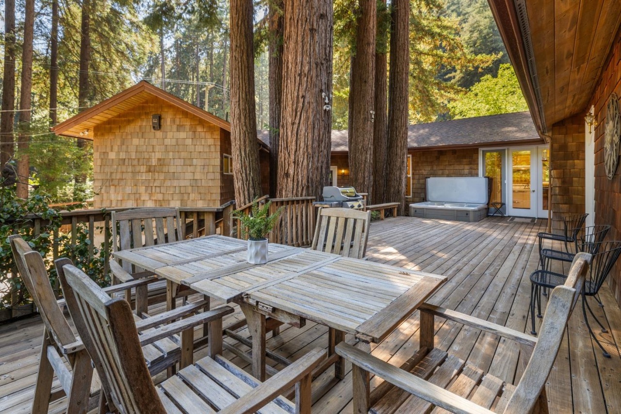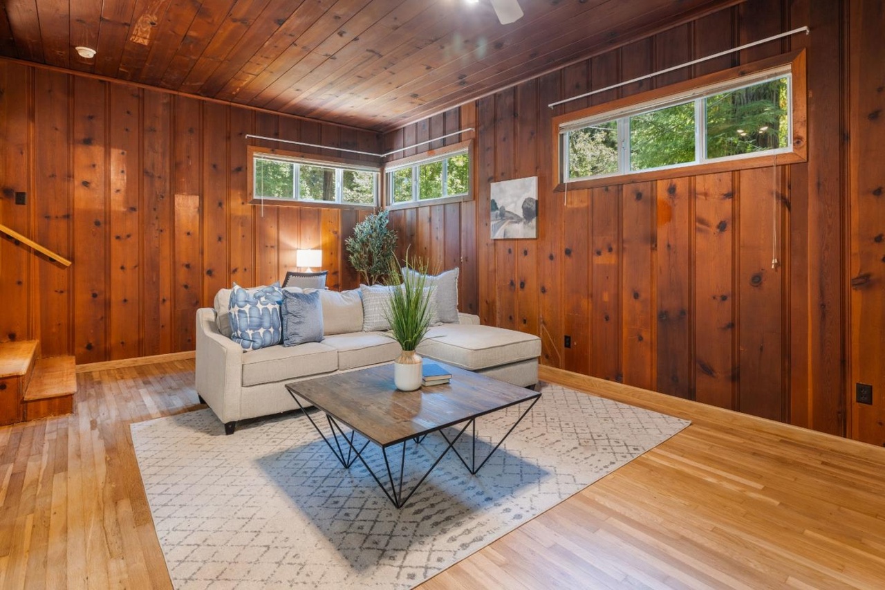 Nestled in Lompico, 844 Trinkling Creek invites you to wake up to the sounds of birdsong. This spacious 2 bed/3 bath home boasts a thoughtfully designed floor plan with stunning views from every window. An extensive permitted remodel and addition was completed in 2005. Enjoy vaulted ceilings, an updated kitchen with maple cabinets, Quartz countertops, built-in bar seating, and a gas stove for those who appreciate an old-fashioned flair. The kitchen opens onto the dining area and a large living room that features a fireplace, perfect for snuggling up with a book. The living room, kitchen and family room include sliders that lead out to a large deck that includes a cozy hot tub that is surrounded by redwood trees, perfect for unwinding under the stars. The family room is a bonus space, and features refinished hardwood floors, gorgeous wood paneling, and a fireplace. It could be used as a bedroom, office, or music room. The yard offers flat, usable land ideal for gardening, a workshop for storing tools. Conveniently located just a few blocks from Lake Loch Lomond. Loch Lomond is the best kept secret Lompico has to offer and admission is free after 4 PM. Just a short drive from downtown Felton with easy access to restaurants, hiking and biking trails, and essential shops.