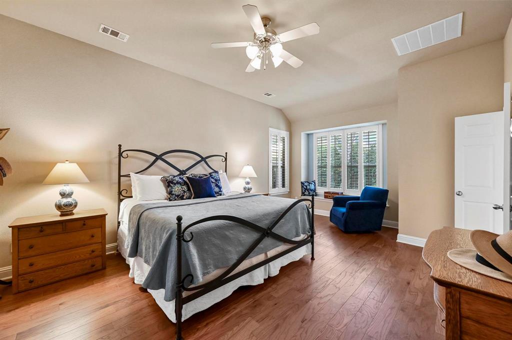 WARM & INVITING 2 STORY WITH A TANDEM 3 CAR GARAGE IN A QUIET CUL-DE-SAC NEAR LANTANA GOLF CLUB! Feel the charm the moment you step inside to plantation shutters, wood floors, soaring ceilings, crown molding, an open-concept floorplan, cozy fireplace, home office, radiant barrier & ample storage space throughout. Cooking is a breeze in the pristine kitchen featuring granite counters, under cabinet lighting, an island & a walk-in pantry. End your day in the downstairs primary suite showcasing a soaking tub, separate vanities, linen closet, separate shower, sitting area & a walk-in closet with built-ins, or spend time with friends & family in the spacious game room. Enjoy the outdoors in your private, low-maintenance backyard including lush landscaping, a freshly stained fence, side deck with a storage shed & a huge covered patio with a hot tub, ceiling fan & roller shades. Recent roof, gutters, water heater, HVAC units, deck & kitchen garbage disposal. Fridge conveys. Lantana amenities!